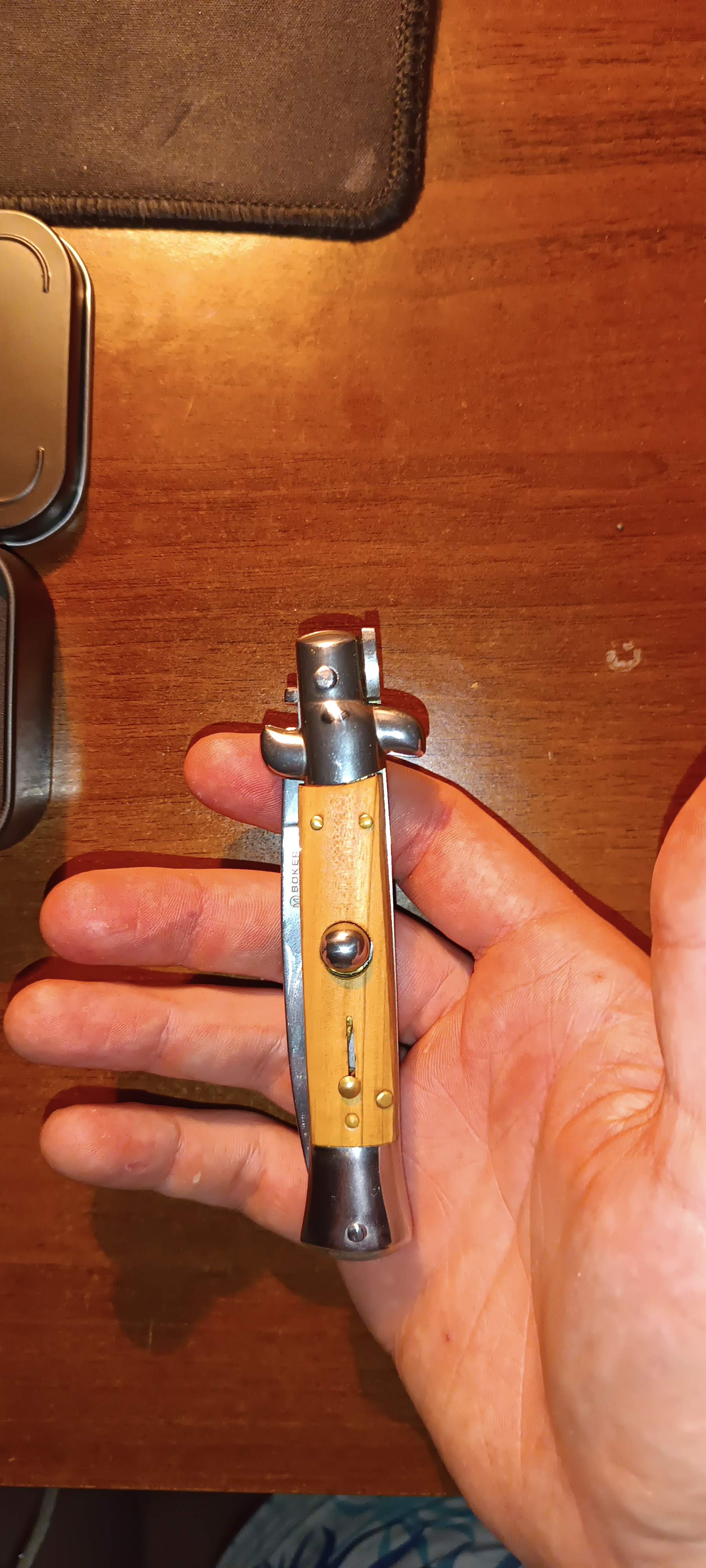 Первое: небольшой люфт клинка, но это я так понимаю не убрать из автоматического ножа.
